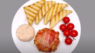 Na plech rozložte pečicí papír. Brambory v míse smíchejte s kořeněným olejem a dejte je na plech. Ten vložte do trouby péct společně s masem, zhruba na 10 až 20 minut, aby se na bramborách vytvořila kůrka. Po dopečení je posypejte rozmarýnem s česnekem a podávejte k masu a zelným listům.