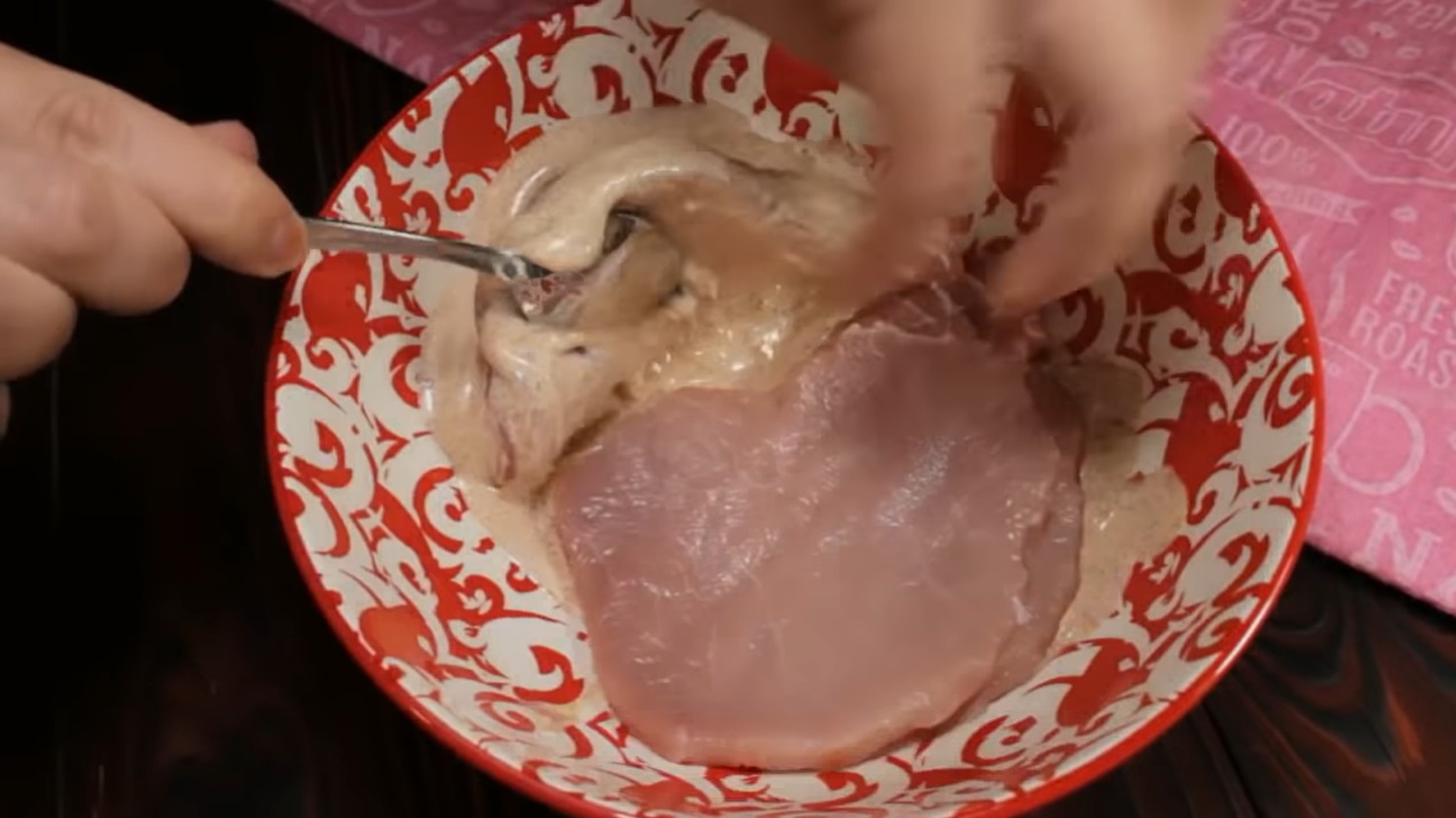 Ve smetanové směsi obalte z obou stran všechny masové kapsy. Vložte je do lednice a nechte 20 minut marinovat.