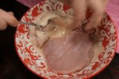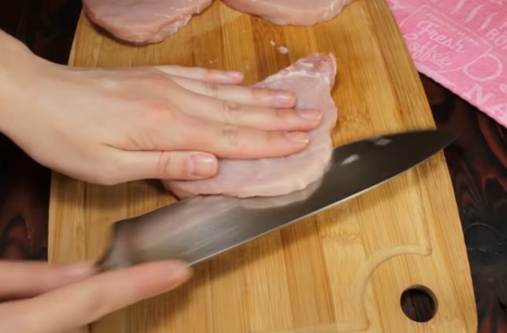 Maso vyrovnejte na prkénko, překryjte igelitovou fólií a válečkem ho jemně naklepejte a rozválejte, aby se poněkud roztáhlo.