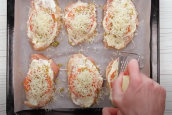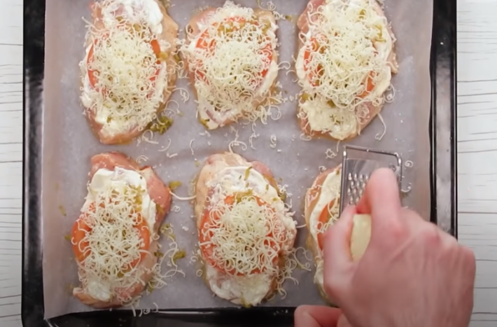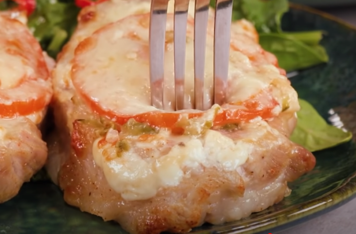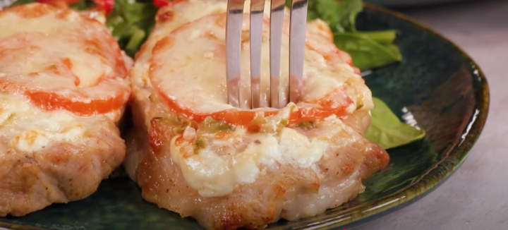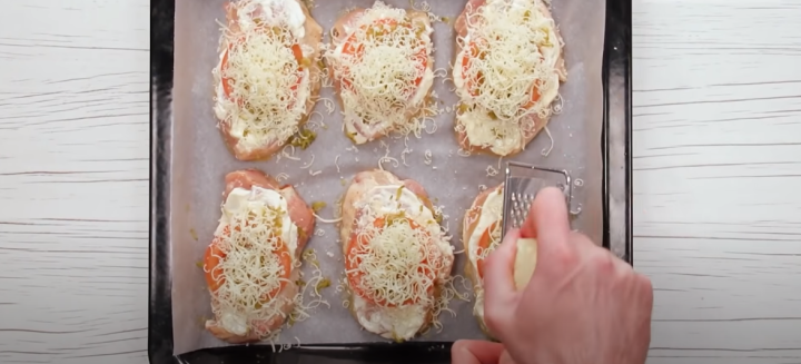 Na povrch kotletek namažte přiměřené množství majonézy, na tu položte tenký plátek rajčete, pokračujte najemno strouhanou kyselou okurkou a vše zakončete nahrubo strouhaným tvrdým sýrem. Pokrm zapékejte v troubě asi 35 minut při teplotě 180 °C.