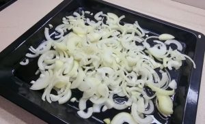 Oloupejte tři cibule. Rozkrojte je na poloviny a nasekejte je na půlkulaté plátky, které prsty oddělte od sebe. Plech na pečení vytřete větší vrstvou rostlinného oleje a vsypte na něj pokrájenou cibuli, kterou rozprostřete po celé ploše.