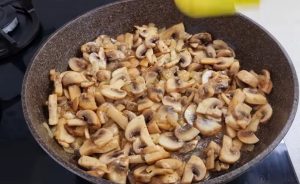 Vezměte poslední cibuli a nasekejte ji najemno. Na kamnech rozehřejte pánev s trochou rostlinného oleje a když je horká, vsypte na ni cibuli a smažte ji dvě až tři minuty. Mezitím nakrájejte žampiony na tenké plátky (ty větší můžete ještě přepůlit či rozčtvrtit) a když cibulka začne růžovět, přihoďte k ní houby do pánve. Vše společně restujte asi 10 minut, dokud houby na povrchu nezačnou zlátnout. Pak přidejte sůl a mletý černý pepř, vše dobře promíchejte a odstavte z kamen.