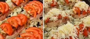 Vepřové maso pečené na cibuli s houbami, rajčaty a sýrem - postup přípravy