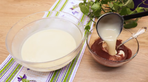 Z mísy s tekutým těstem odeberte jednu naběračku do vedlejší misky a zapracujte do této části jednu polévkovou lžíci kakaa. Dobře ho rozmíchejte, abyste získali jednolitou hnědou hmotu. K té pak přilijte další dvě naběračky těsta a znovu dobře promíchejte. Tmavou směs pak nalijte do půllitrové plastové láhve, zavíčkujte a do víčka vytvořte nahřátou špízovou jehlou díru.