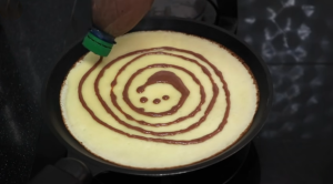 Druhou možností, jak palačinku vytvořit, je nalít spirálu přímo na plochu pánve a když ztuhne, zalijte ji bílým těstem. Zbytek postupu se pak opakuje stejně jako v předchozí variantě. Tímto postupem vytvoříte kroužkování, které je jemnější a je viditelné i z druhé strany palačinky.