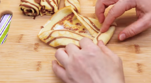 Na kamnech rozehřejte pánev vymazanou trochou oleje, vlijte do ní naběračku bílého těsta a rozlijte ho po celé ploše pánve. Z láhve pak ihned vytvarujte čokoládovým těstem po celé ploše palačinky spirálu či jiné cákance. Jakmile těsto na povrchu ztuhne, můžete palačinku otočit na druhou stranu. Když je hotová, ještě horkou posypejte palačinku z bílé strany lžičkou cukru a stočte placku do roličky tak, že dvě protilehlé strany přehnete doprostřed a zbytek srolujete.