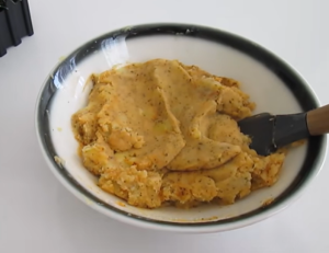 Zatímco těsto kyne, připravte si náplň. Oškrábejte dvě velké brambory a rozkrájejte je na malé kousky. Vsypte je do hrnce, zalijte je vodou a nechte uvařit doměkka. Uvařené brambory pak rozšťouchejte na kaši. Přidejte do kaše sůl, pepř, červenou papriku a sušenou mátu a veškeré koření stěrkou dobře do bramborové kaše zapracujte.