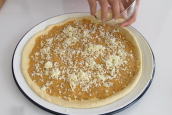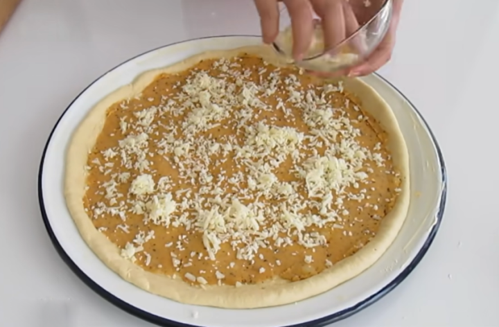 Nyní už by mělo být těsto vykynuté. Opatrně ho proto vyndejte ven z mísy, lehce ho posypejte hladkou moukou, prohněťte a rozdělte jej na dvě části. Každou z nich vyválejte na velkou kulatou placku. První placku přesuňte na talíř vytřený máslem, vyklopte na ni kořeněnou bramborovou kaši a stěrkou ji rozprostřete po celé ploše těsta. Navrch nasypejte strouhaný čedar nebo jiný oblíbený sýr a zakryjte druhou rozválenou plackou. Spoje na okrajích podhrňte dospodu, abyste placky uzavřeli a chléb se následně nerozbaloval.