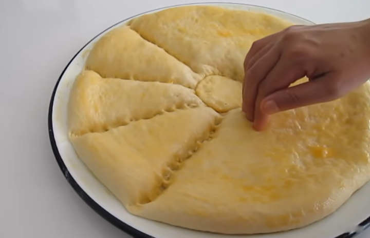 Povrch potřete vaječným žloutkem. Malou skleničkou doprostřed vykrojte kulatý střed a s pomocí prstů vymačkejte od středu ke krajům paprsky, jako byste vytvářeli sluníčko. Linie „sluníčka“ posypejte mákem a plochu trojúhelníkových dílů světlými a tmavými sezamovými semínky. Celý povrch pak posypejte jemně nasekanou čerstvou petrželkou. Vložte dobrotu do trouby rozpálené na 180 °C a pečte ji po dobu 30 minut. Po dopečení nechte mírně zchladnout a podávejte.