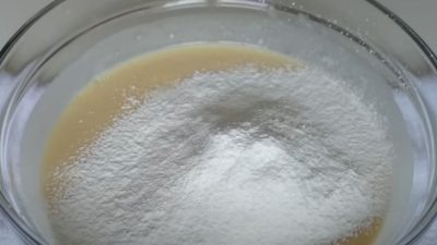 Do směsi prosejte mouku, kukuřičný škrob, prášek do pečiva a sůl. Směs vymíchejte do hladkého těsta a dejte ho stranou.