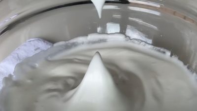 Bílky vyšlehejte do pěny. Poté do nich přidejte ocet a postupně ve 3–4 dávkách přisypávejte cukr. Šlehejte, dokud nevznikne pevný sníh. Na závěr ho šlehejte na nejnižší rychlost 30 sekund, aby se odstranily vzduchové bubliny.