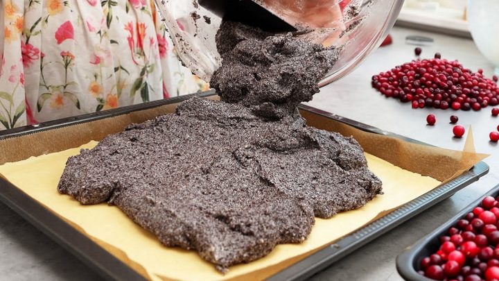Vláčný koláč s makovou náplní ozdobte nakládanými brusinkami a pečte ho v předehřáté troubě na 160 °C po dobu 40 minut. Po vychladnutí dezert posypte moučkovým cukrem a servírujte ho nakrájený na kousky.