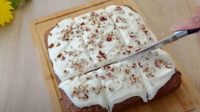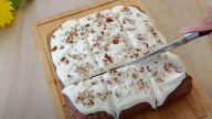 Vychladlý korpus potřete krémem, který připravíte vyšleháním smetanového sýra, másla a moučkového cukru. Vláčný mrkvový koláč posypte nasekanými ořechy a servírujte ho nakrájený na kousky.