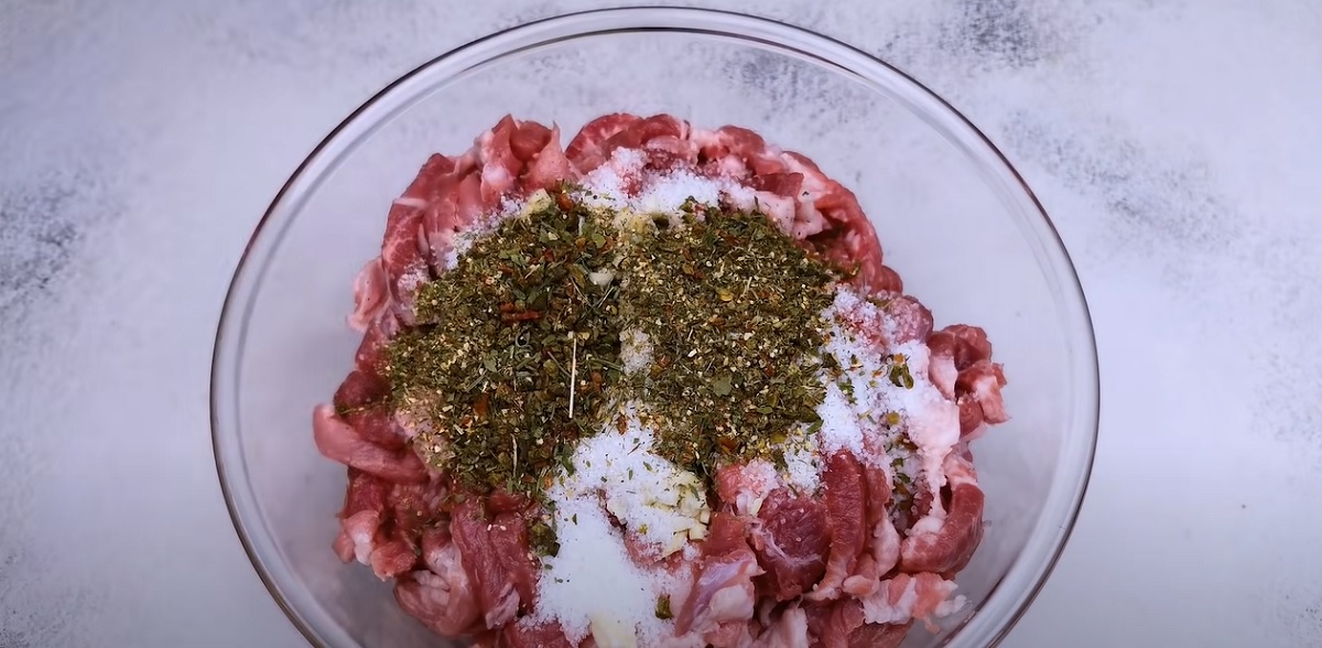 Maso vložte do hluboké mísy a přidejte nasekaný česnek, sůl a směs koření.