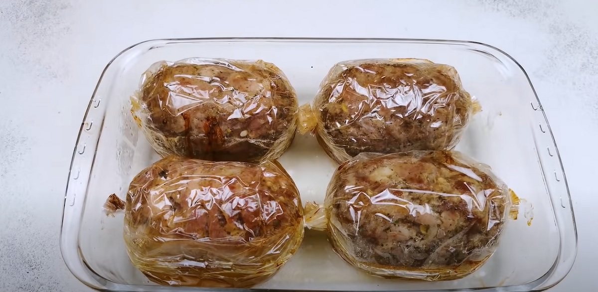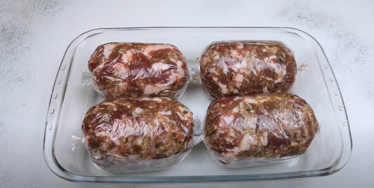 Každý kus zvlášť zabalte do alobalu a dávejte pozor, aby mezi fólií a masem nezůstal žádný volný prostor a nezůstal tam žádný vzduch. Konce fólie dobře stočte a svažte nití.