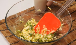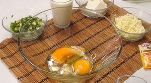 Sýr čedar (případně jakýkoliv jiný oblíbený sýr) nastrouhejte na hrubém struhadle. Balkánský sýr buďto rovněž nastrouhejte, anebo ho jen v prstech rozdrťte na malé kousky. Šest nebo sedm kousků jarních cibulek nasekejte na hrubá kolečka.