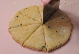 Nakonec přilijte do misky mléko, vsypte prášek do pečiva a také hladkou mouku a zadělejte hutné těsto. Nejprve jej promíchejte špachtlí a poté jej začněte hníst rukou. Výsledkem by mělo být pevné, soudržné a nelepivé těsto. Zformujte ho do tvaru koule, pomoučněte jeho povrch a rozdělte ho na dvě poloviny. Každou z nich opět vytvarujte na kouli, mírně rukama rozprostřete do silné kulaté placky. Tu rozkrájejte na osm dílků. Totéž udělejte i s druhou těstovou plackou.