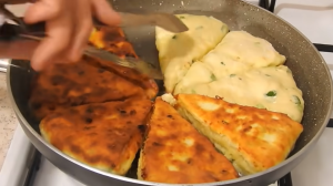 Na kamnech zahřejte pánev s vrstvou rostlinného oleje a když je horký, vyskládejte na pánev první sadu trojúhelníčků. Smažte je několik minut, dokud spodní strana nezezlátne, a otočte je na druhou stranu. Pokračujte v dopékání několik dalších minut, aby byly trojúhelníčky zespodu zlatavé a uvnitř propečené, jemné a nadýchané. Po dopečení nechte trojúhelníčky okapat na papírových utěrkách a ještě čerstvé podávejte.