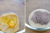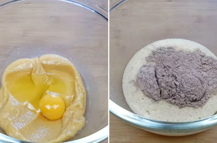 Promíchejte hmotu špachtlí, vyklepněte do ní nejprve jedno vajíčko a vyšlehejte ho ve směsi dohladka. Pak přidejte i druhé vejce a znovu zašlehejte. Pak do této misky přidejte po třetinách směs mouky a kakaa. V tu chvíli by vám po zamíchání mělo zůstat v misce elastické těsto.