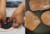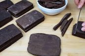 Hotové sušenky nechte vychladnout na mřížce a odřízněte jejich okraje tak, aby byly všechny stejně velké a rovné. Každý obdélník pak ještě podélně rozřízněte, takže získáte 24 tenkých sušenek. Odřezky nevyhazujte, použijete je k dekoraci dortu.