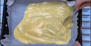 Plech na pečení pokryjte pečicím papírem a přeneste do něj čtvrtinu celkového množství těsta. Stěrkou ho rozprostřete do tvaru obdélníku a vložte ho do trouby vyhřáté na 180 °C péct po dobu 10 minut. Stejným způsobem pak upečte i další tři zbývající pláty těsta (dejte pozor, aby korpusy nebyly příliš silné, to by v dortu nevypadalo pěkně).