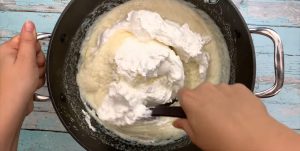 Zatímco se korpusy pečou a následně chladí, připravte si smetanový krém. Do hrnce nalijte mléko a přiveďte ho na středním ohni k varu. Přidejte k němu krupici a cukr a za stálého míchání pokračujte ve vaření, dokud směs nezhoustne. Hotovou krupičnou kaši odstavte z kamen, její povrch zakryjte potravinářskou fólií tak, aby ležela přímo na povrchu směsi (tak se nevytvoří škraloup) a nechte ji úplně vychladnout. Ve vedlejší misce vyšlehejte šlehačku do tuhé pěny a zapracujte ji do vystydlé krupicové kaše.