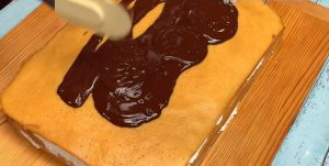 V parní lázni rozpusťte čokoládu nalámanou na menší kousky a přelijte ji tekutou plnotučnou smetanou. Míchejte směs tak dlouho, dokud nezískáte hladkou, lesklou a tmavě hnědou polevu, kterou nalijte na vrchní plát těsta a rovnoměrně ji rozetřete po celém povrchu dortu. Nakonec celé cukrářské dílo vložte do lednice, kde ho nechte nejlépe přes noc vychladnout a ztuhnout. Druhý den naporcujte na obdélníkové porce a podávejte s čajem nebo kávou.