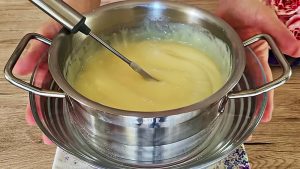 Jako první připravte vanilkový pudink. Do kastrůlku vyklepněte dvě vejce, přidejte klasický cukr, vanilkový cukr a kukuřičný škrob a vše metličkou vyšlehejte do homogenní konzistence. Poté přilijte po několika dávkách mléko, promíchejte a na sporáku přiveďte k varu, přičemž bez ustání směs míchejte, aby se v ní nevytvořily hrudky. Pokračujte ve vaření a míchání, dokud nezískáte velmi hustý pudink. Ten odstavte ze sporáku a hrnec vložte do mísy s ledovou vodou a kostkami ledu. Promíchejte pudink, abyste rozbili vznikající škraloup, a nechte ho vychladnout.