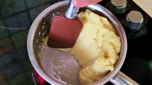 Nyní připravte odpalované těsto. Do kastrůlku vložte máslo, přidejte k němu asi půl lžičky soli a cukru a vše zalijte mlékem a vodou. Směs postavte na sporák a za stálého míchání vařte, dokud se máslo úplně nerozpustí. V tu chvíli do rendlíku vsypte hladkou mouku a stěrkou míchejte tak, že těsto třete o dno. Pokračujte v míchání, dokud nezískáte soudržnou hmotu lehce nazlátlé barvy. Poté těsto odstavte ze sporáku a nechte ho vychladnout.