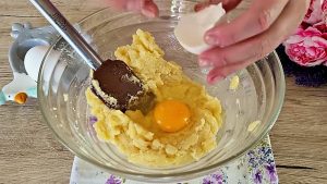 Do zchladlého těsta vyklepněte jedno vajíčko a důkladně ho zapracujte. Poté přidejte další vejce a znovu jej zapracujte. Nakonec přidejte ještě jedno. Po jeho zapracování byste měli získat vláčné a lepivé těsto. Pokud by stále bylo příliš husté, přidejte ještě čtvrté vejce.