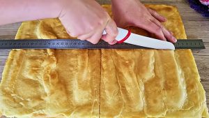 Hotové těsto rozdělte na dvě poloviny a každou rozetřete do roviny na obdélníkový plech. Placky vložte do trouby rozehřáté na teplotu 200 °C a pečte je asi 10 až 15 minut. Po vychladnutí pak každou placku rozkrojte křížem, čímž získáte 8 stejně velkých obdélníčků.