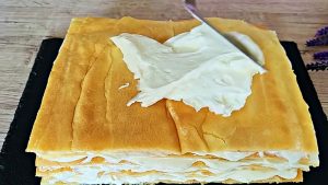 Milovníci věnečků a větrníků nechť nyní zpozorní, neboť tento dort je jejich splněným snem. Několik plátů křehkého odpalovaného těsta je proloženo lahodným vanilkovým pudinkem a kolem dokola toto mistrovské dílo zdobí tenké plátky mandlí.