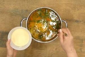 Promíchejte a vařte 10 minut na mírném ohni (klasicky pod pokličkou). Poté přidejte nudle a vařte 12 minut na mírném ohni. Do misky rozklepněte vejce a vyšlehejte jej se smetanou. Hrnec sundejte ze sporáku, nasypejte do něj čerstvou petrželku a promíchejte. Poté trochu polévky naberte a smíchejte ji se smetanou a vejcem. Směs nalijte zpět do hrnce, čímž jeho obsah zahustíte. Nyní můžete podávat, dobrou chuť!