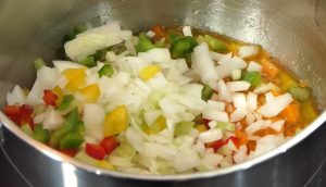Mrkev oloupejte a nakrájejte na kostičky, v hlubokém hrnci rozehřejte olej a dejte do něj mrkev. Osolte a smažte tři minuty pod pokličkou. Cibuli, celer a papriky nakrájejte nadrobno, přidejte do hrnce a smažte 7 minut pod pokličkou. Poté zalijte litrem a půl vody. Důkladně promíchejte a opět zakryjte pokličkou.