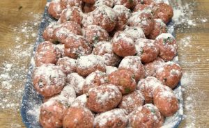Směs důkladně prohněťte rukama. Na menší tác nasypejte hladkou mouku, ruce si potřete olejem a začněte tvarovat knedlíčky. Ty poté dejte na mouku. Na závěr je rovněž moukou všechny zaprašte a po jednom je vhazujte do vařící se polévky.
