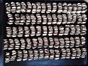Ve vodní lázni rozehřejte tmavou čokoládu. Nyní máte dvě možnosti: buďto s ní polijte každý rohlíček tak, aby byl kompletně namočený v polevě (toto je standardní podoba pařížských rohlíčků), anebo polevou naplňte zdobicí sáček a rohlíčky jí ozdobně postříkejte. Toto sice není běžná podoba rohlíčků, nicméně to přesto vypadá velmi krásně a úhledně.