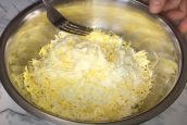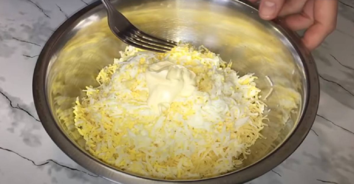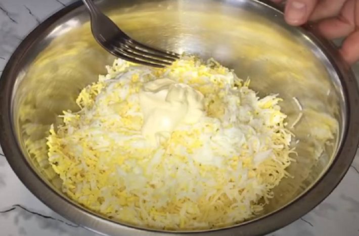 Uvařená vejce a sýr nastrouhejte na jemném struhadle. Přidejte k nim sůl a mletý černý pepř podle chuti, prolisovaný česnek a majonézu. Důkladně promíchejte.