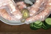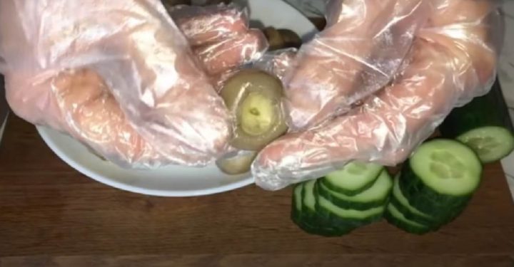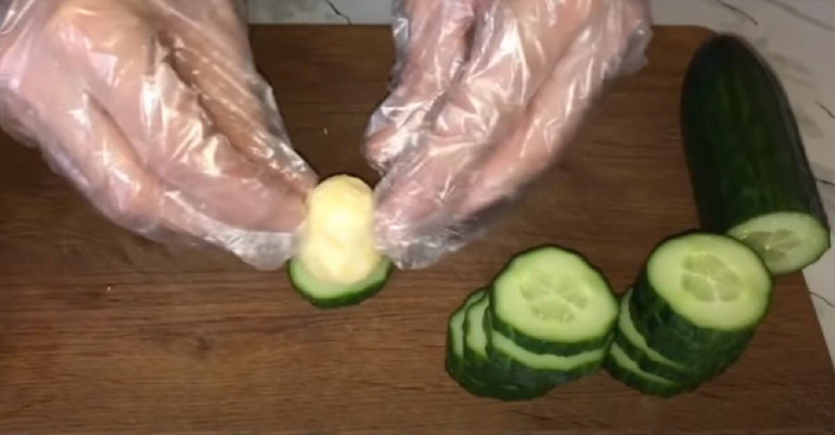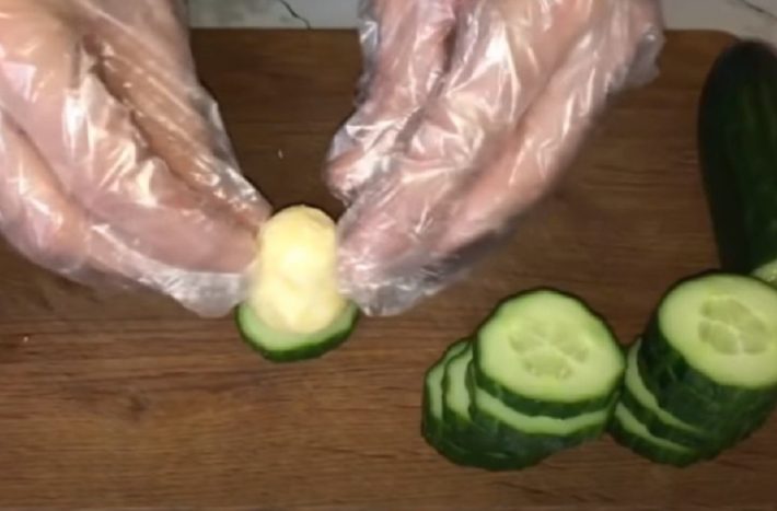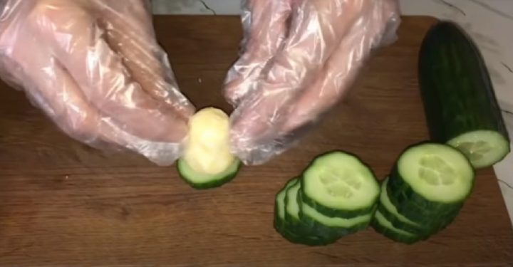 Musí vzniknout homogenní směs, se kterou budete moci následně pracovat. Okurky nakrájejte na plátky silné asi 5 mm. Ze žampionů opatrně vyndejte nohy, aby se v kloboučku utvořili malé otvory.