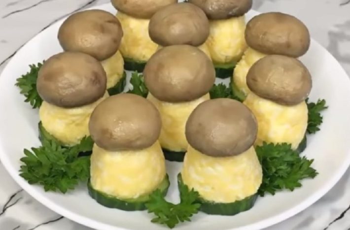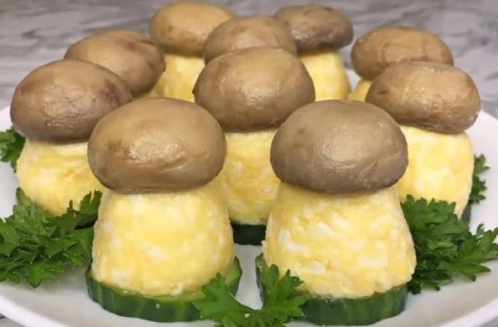 Zábavný předkrm ve tvaru hříbku z vajec a sýra