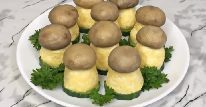 Na tuto nohu nasaďte klobouk ze žampionu. Na talíře dejte hlávkový salát, petržel nebo jinou zeleň, která bude představovat trávu či mech. Na tento podklad dejte připravené vaječné houby a podávejte hostům jako zajímavý předkrm, který předtím nikdy neviděli.
