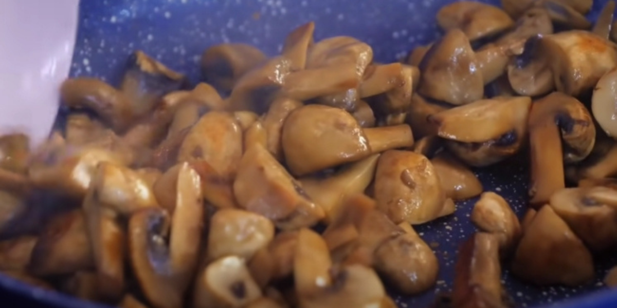 Na kamnech rozehřejte pánev asi s jednou a půl polévkovou lžící rostlinného oleje. Když je horká, přihoďte na ni žampiony. Houby nejprve pustí spoustu vody, kterou je třeba nejprve odpařit, a proto je často míchejte. Když se z pánve přestane kouřit, ztlumte plamen na minimum a restujte houby dozlatova, což bude trvat kolem 15 až 20 minut.
