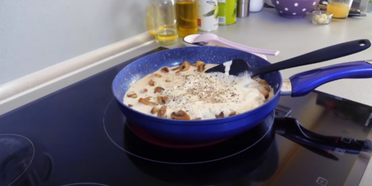 Když houby zezlátnou, přilijte zakysanou a sladkou smetanu, dochuťte solí a mletým černým pepřem, promíchejte a přiveďte k varu.