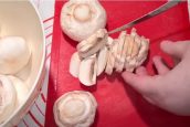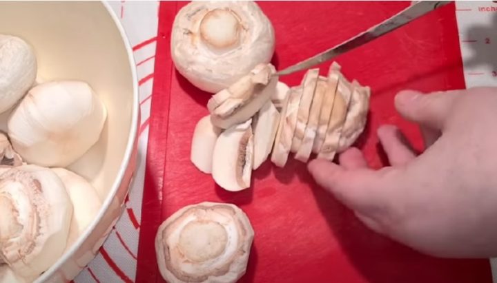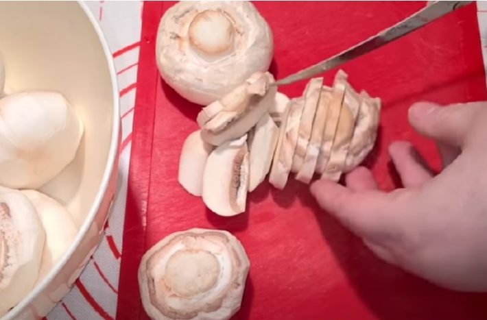 Houby si očistěte a nakrájejte na silnější plátky. Pokud máte malé kloboučky, nemusíte je krájet a můžete je použít celé.