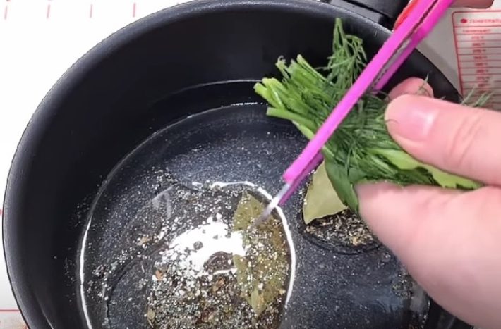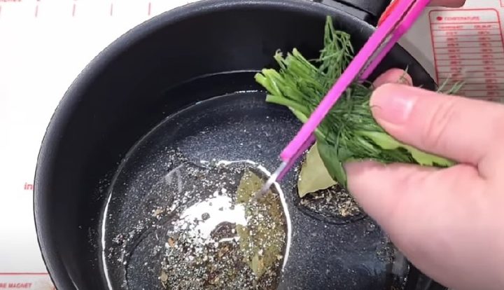 Do hrnce, ve kterém budete houby vařit, dejte vodu, olej, sůl, cukr, mletý koriandr, pepř, sušené bylinky (jako například sicilskou směs) a bobkový list. Pak nastříhejte několik snítek petrželky a kopru. Vše promíchejte a dejte vařit na sporák.