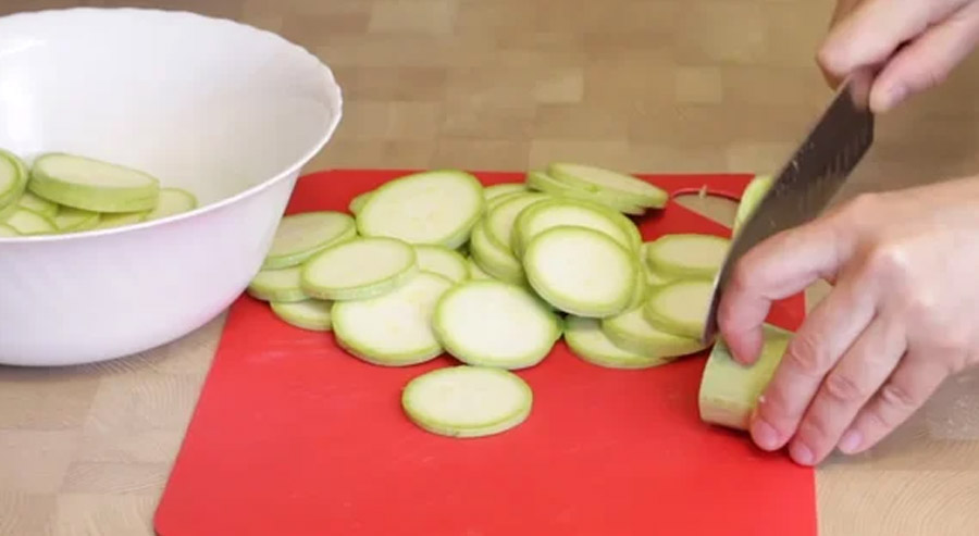 Mezitím si omyjte cukety, odstraňte konce a nakrájejte na tenké plátky o šíři asi 3 mm, posypte plátky solí, abyste cukety zbavili přebytečné vody.