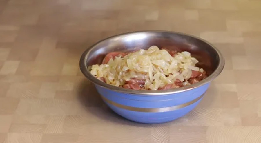 Nyní si připravte kuřecí maso, můžete použít také krůtí, nakrájejte jej na tenké proužky. Poté smíchejte maso s osmahnutou cibulí.