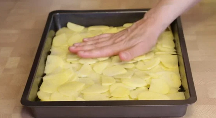 Vezměte si pekáč nebo hluboký plech a vymažte jej rostlinným olejem. Začněte vrstvit, první vrstvu začněte s bramborami, které rozložte rovnoměrně po řádcích po celém plechu.