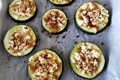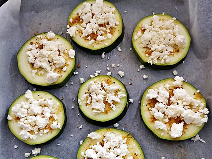 Cuketu nakrájejte na kolečka silná asi půl centimetru a po obou stranách je potřete olivovým olejem. Kolečka vyskládejte na plech pokrytý pečicím papírem, posypejte je kořením na grilovanou zeleninu a navrch rozdrobte trochu balkánského sýra.