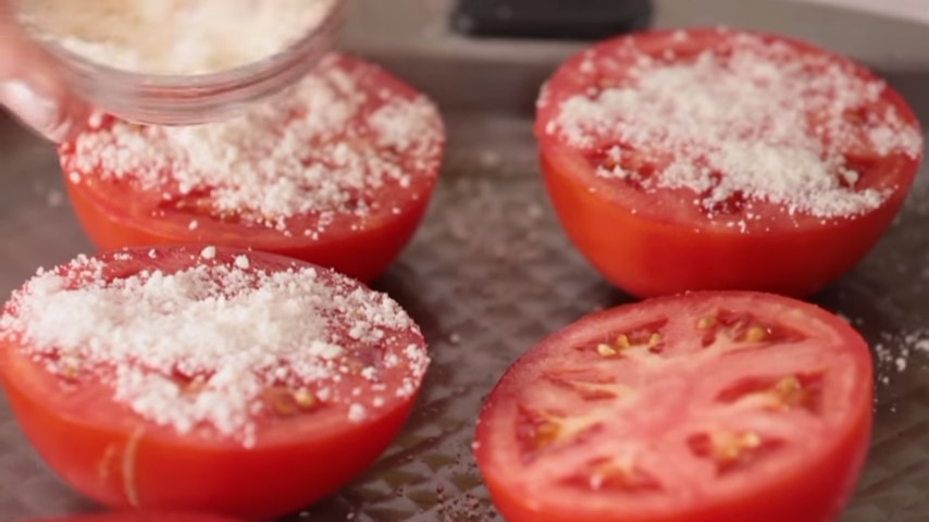 Parmazán nebo jiný druh sýra nastrouhejte na jemném struhadle a zlehka jím posypejte povrch rajčat. Sýrový posyp nesmí být příliš hojný, jinak by se rajčata uzavřela a nepropekla by se. Povrch sýra pak posypejte sušeným oreganem, případně také solí a pepřem, případně můžete přihodit ještě jemně nasekanou čerstvou petrželku nebo koriandr.