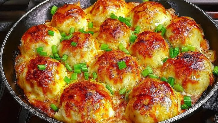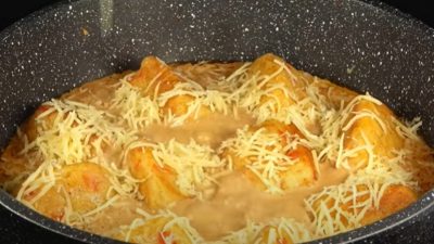 Do pánve přidejte rajčatový protlak, sójovou omáčku, vodu se smetanou a směs vařte 2–3 minuty na mírném ohni. Po této době do omáčky vraťte krokety, které posypte nastrouhaným sýrem, zakryjte pokličkou a vařte 5 minut.